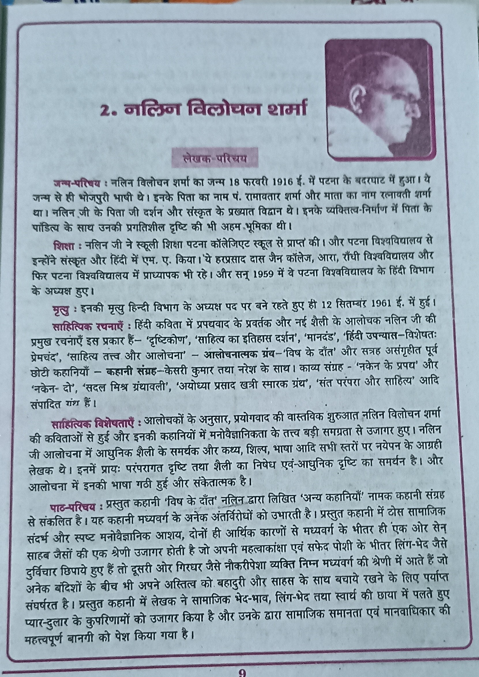 – ‘विष के दांत’ शीर्षक कहानी नलिन विलोचन शर्मा जी की प्रसिद्ध रचना है। प्रस्तुत पाठ ‘विष के दांत तथा अन्य कहानियां’ नामक कहानी संग्रह से लिया गया है। इस कहानी के माध्यम से समाज के मध्यम वर्गीय परिवारों का अंतर्विरोध व्यापक रूप से उजागर होता है। सेन साहब का संबंध यद्यपि मध्यम वर्ग से हैं परन्तु आर्थिक सम्पन्नता के कारण वे स्वयं को किसी सामंत से कम नहीं समझते हैं। संतान के रूप में उसे पांच सुसभ्य लड़कियां और एक दुर्ललित लड़का हैं। लड़कियों के लिए घर में अलग नियम हैं जिसका सख्ती से पालन कराया जाता है परन्तु लड़का इकलौता होने के कारण अपवादस्वरूप है। सेन साहब के द्वारा शिक्षा-दीक्षा में भी भेदभाव किया गया है, लड़कियों को जहां सामान्य स्कूली शिक्षा दी जा रही है वहीं लड़का के लिए कारखाने के बढ़ई मिस्त्री के साथ ठोंक-पीट जैसी प्रायोगिक शिक्षा तय की गई है, क्योंकि खोखा को वे इंजीनियर बनाना चाहते हैं।